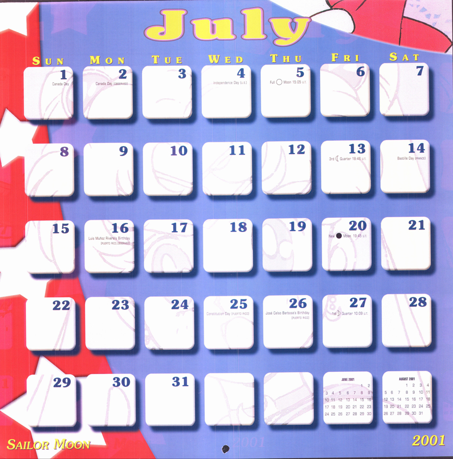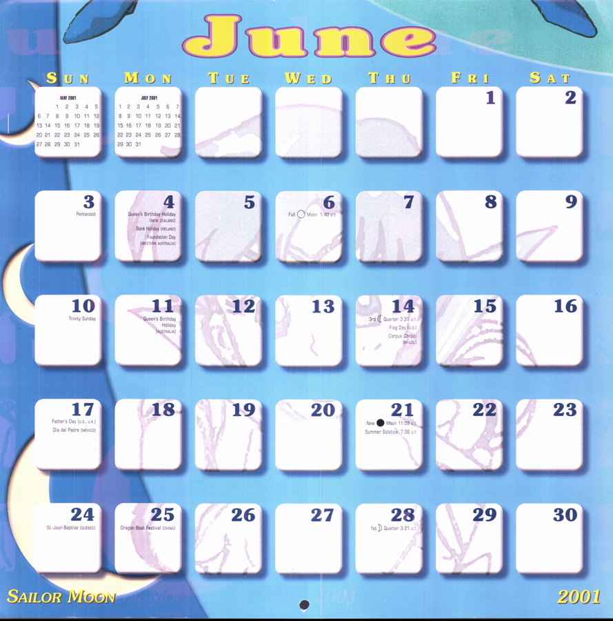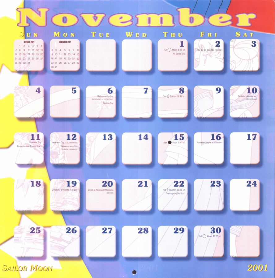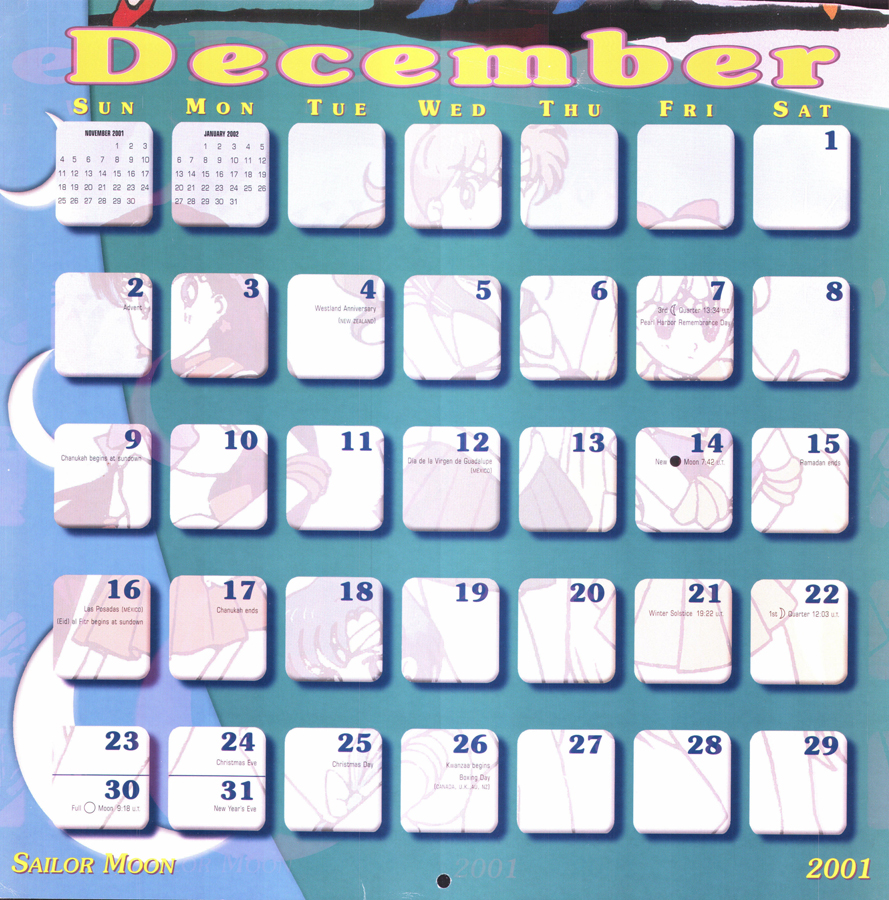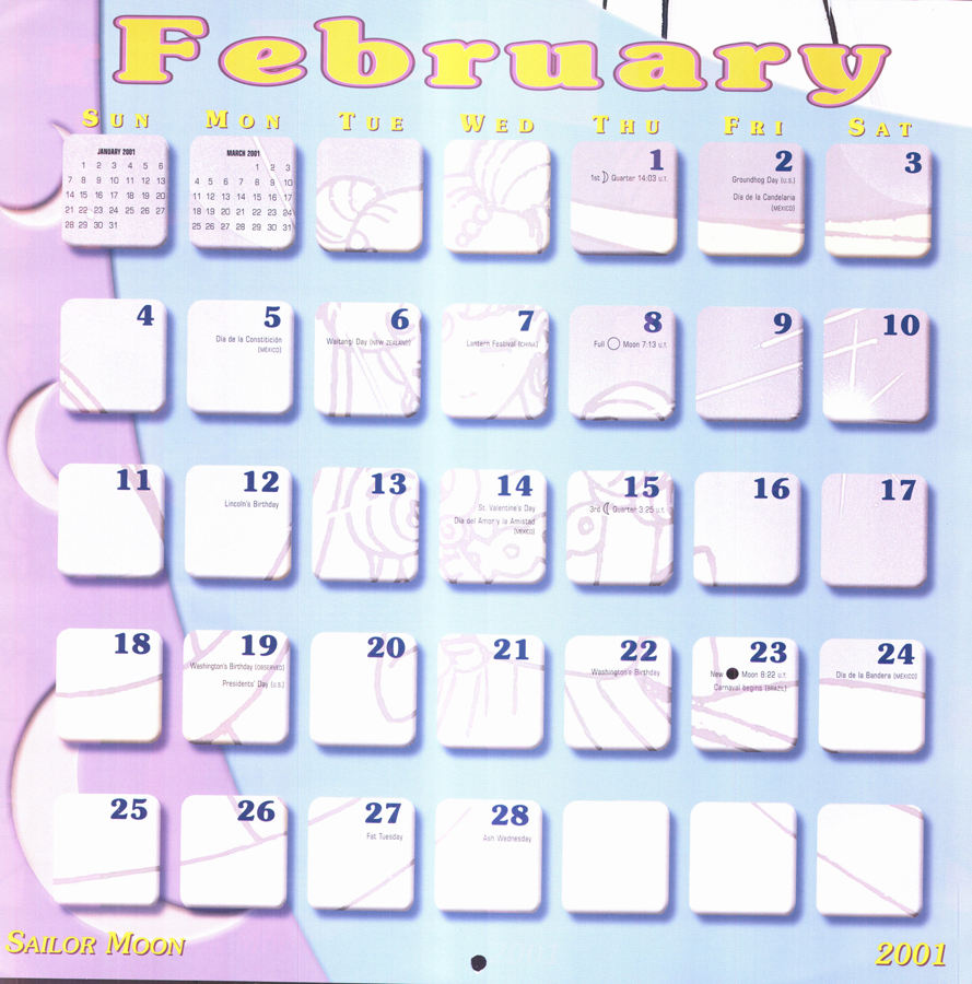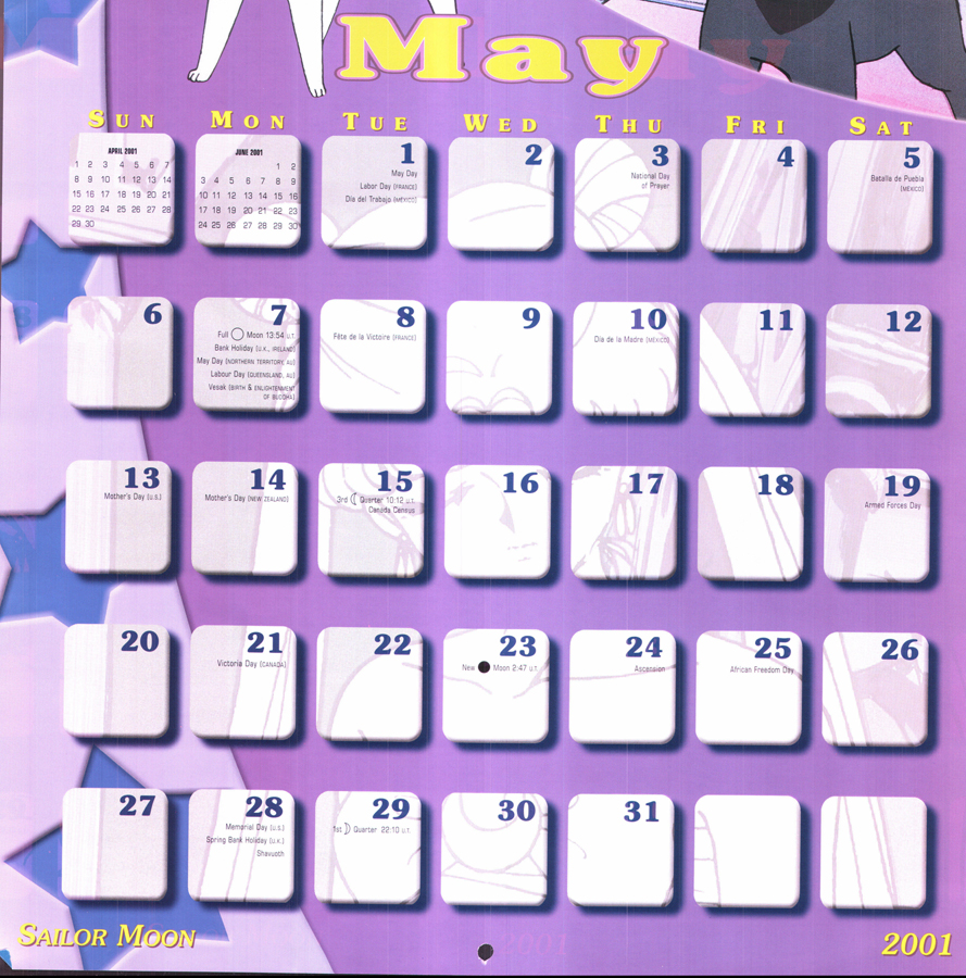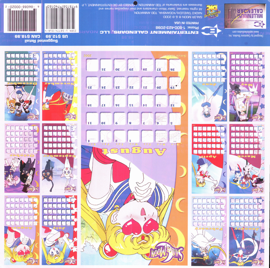 Sailor Moon 2001 Calendar This download is of the North American Sailor Moon 2001 calendar. Special thanks to cyborgarmgun for donating this calendar to be scanned! download: gallery You will need a freeware program like WinRAR or 7zip to unpack the download.